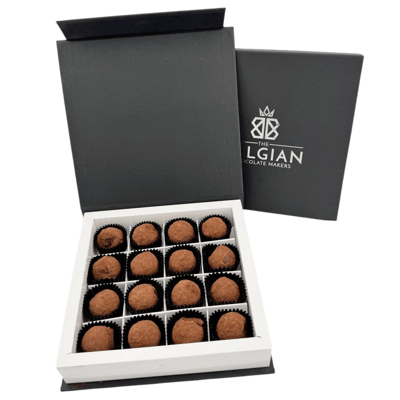 Enjoy our box of 16 Belgian chocolate truffles with rich cacao flavour, handmade in Brussels from ethical beans. A refined gift or gourmet indulgence.