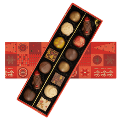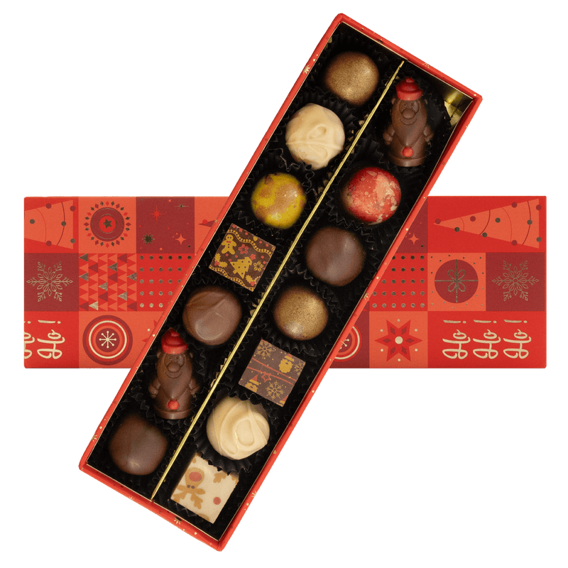 A joyful Christmas gift box combining 14 pralines and truffles (225g), handmade in Belgium. Our Ho-Ho-Ho edition is a delicious way to share the magic of Christmas.