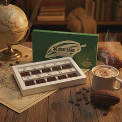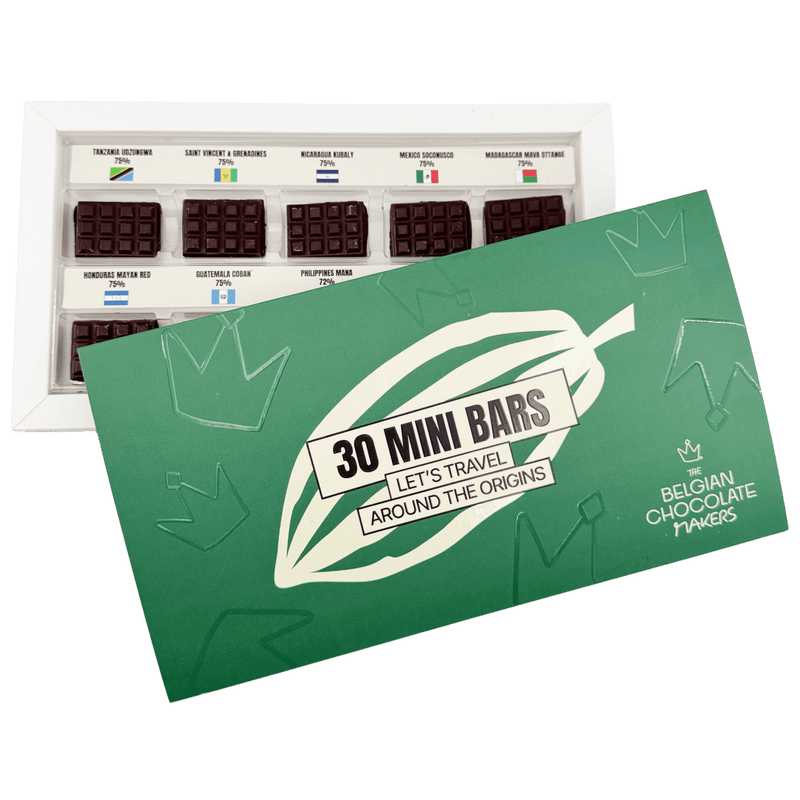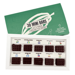 Explore our Belgian chocolate discovery box with 30 mini bars inside from 10 different single origin cacaos. Taste 10 single origin cacao, artisan flavors and gourmet creations, perfect gift or indulgence.