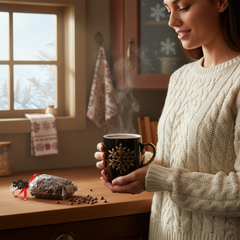 Dark chocolate drops in a snowflake mug 200g, a cosy Belgian winter treat featuring intense dark chocolate drops in a charming snowflake mug. Perfect for gifting, sharing, or enjoying on chilly days.