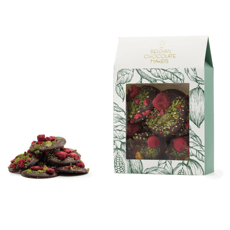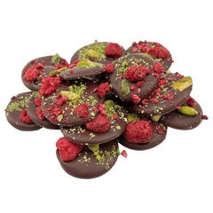 Delicious 150g dark chocolate mendiants topped with raspberry and pistachio chunks, a perfect blend of rich cocoa and crunchy goodness.