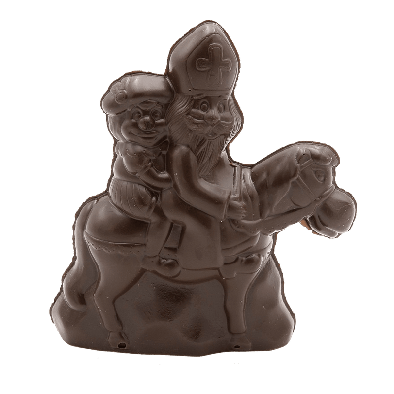 Experience the magic of our 230g dark chocolate Saint Nicholas riding his horse, handcrafted in Belgium from rich, premium cocoa, a majestic festive creation full of tradition and flavour.