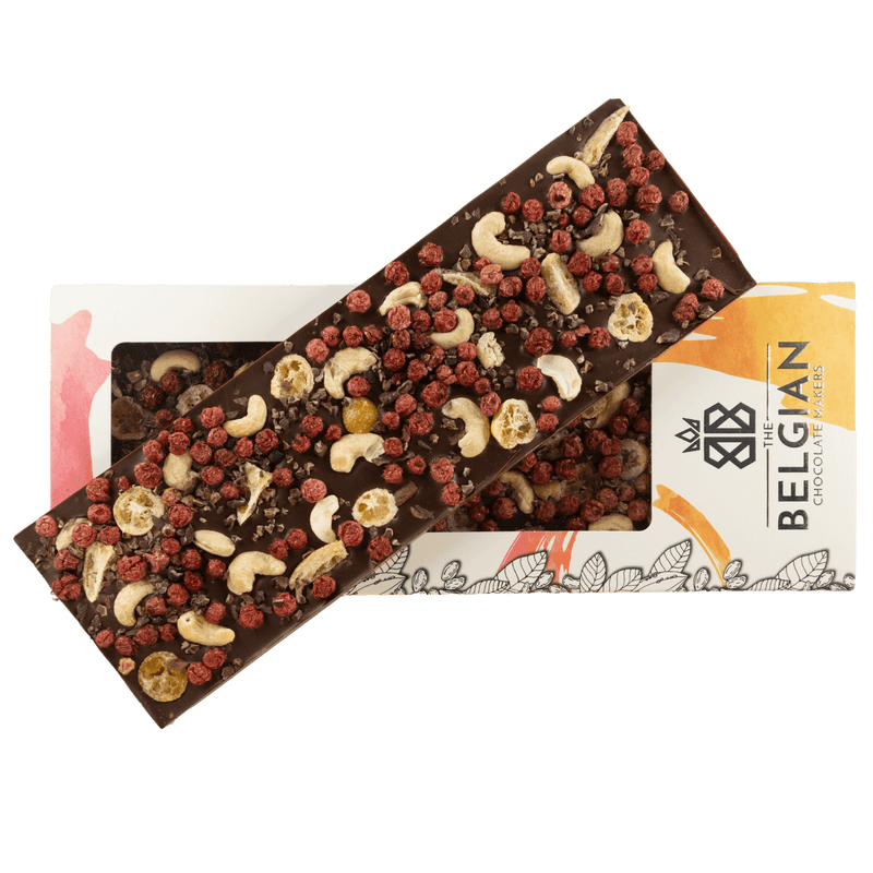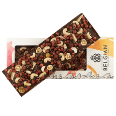 Discover our Fantasy dark chocolate bar 550g, crafted with cacao nibs, cashew nuts, kumquat and redcurrant chunks. An oversized Belgian delight, perfect for gifting or sharing.