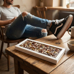 Enjoy our Fantasy dark chocolate bar 550g, enriched with pecan nuts, goji berries, lemon and almond chunks. A gourmet oversized Belgian treat, perfect for sharing or gifting.