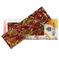 Savor our Fantasy dark chocolate bar 375g, crafted with tangy raspberry, zesty orange and crunchy almond chunks. A gourmet oversized Belgian delight, perfect for gifting or sharing.