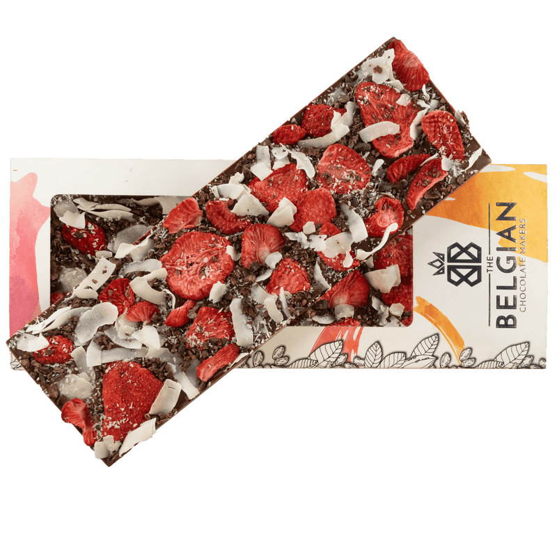 Indulge in our Fantasy milk chocolate bar 550g, enriched with crunchy cacao nibs, strawberry and coconut chunks. A gourmet oversized Belgian treat, perfect for sharing or gifting.