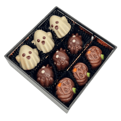 Enjoy Halloween with our box of 9 handmade Belgian pralines (135g). Crafted with premium cacao, this spooky chocolate gift is perfect for sharing or treating yourself.