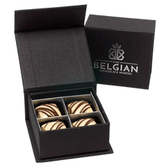 Indulge in our luxury box of 4 Belgian chocolate pralines in caramel flavours, handcrafted in Brussels with ethical cacao. A refined gift or gourmet treat.