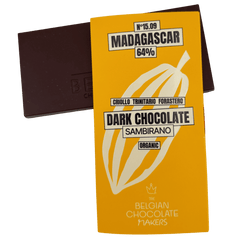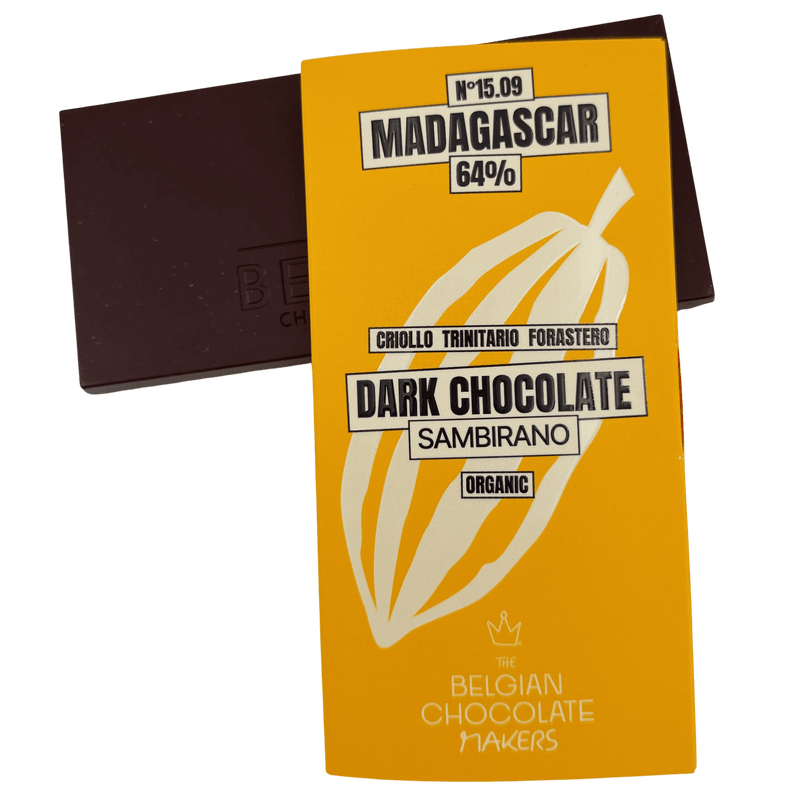Madagascar Sambirano 64% dark chocolate, handcrafted in Brussels from single-origin cacao. A vibrant bar with fruity notes and delicate balance.