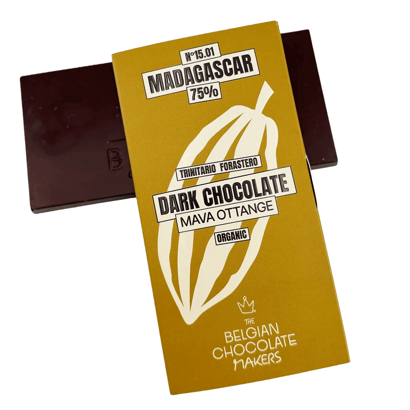 Madagascar Mava Ottange 75% dark chocolate, handcrafted in Brussels from single-origin cacao. A refined bar with bright fruity notes and elegant complexity.