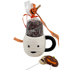 Spooky and delicious! Our mummy-themed cup is filled with creamy Belgian milk chocolate drops and fun lollipops. A perfect Halloween gift for kids and chocolate lovers.