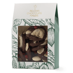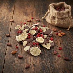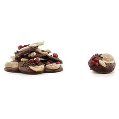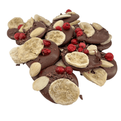 Delicious 150g milk chocolate mendiants topped with banana, almond and pecan chunks, a perfect blend of rich cocoa and crunchy goodness.