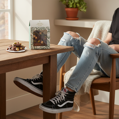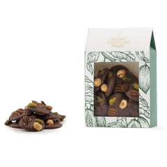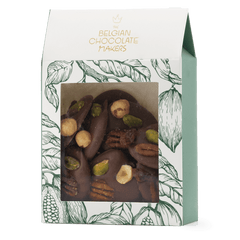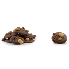Delicious 150g milk chocolate mendiants topped with pecan, pistachio, raisin and hazelnut chunks, a perfect blend of rich cocoa and crunchy goodness.