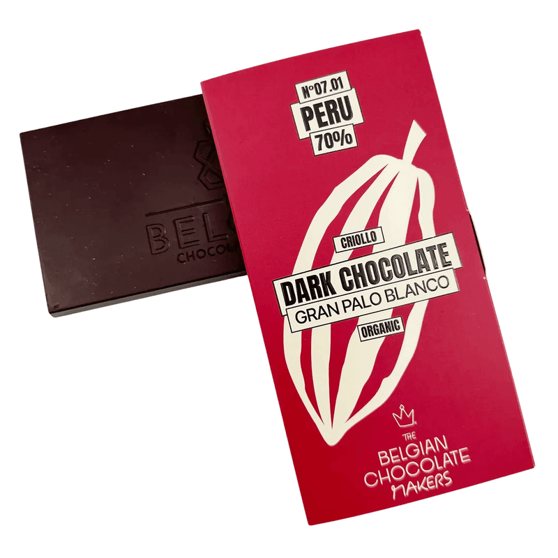 Peru Gran Palo Blanco 70% dark chocolate, handcrafted in Brussels from single-origin cacao. A rare bar with delicate floral notes and refined complexity.
