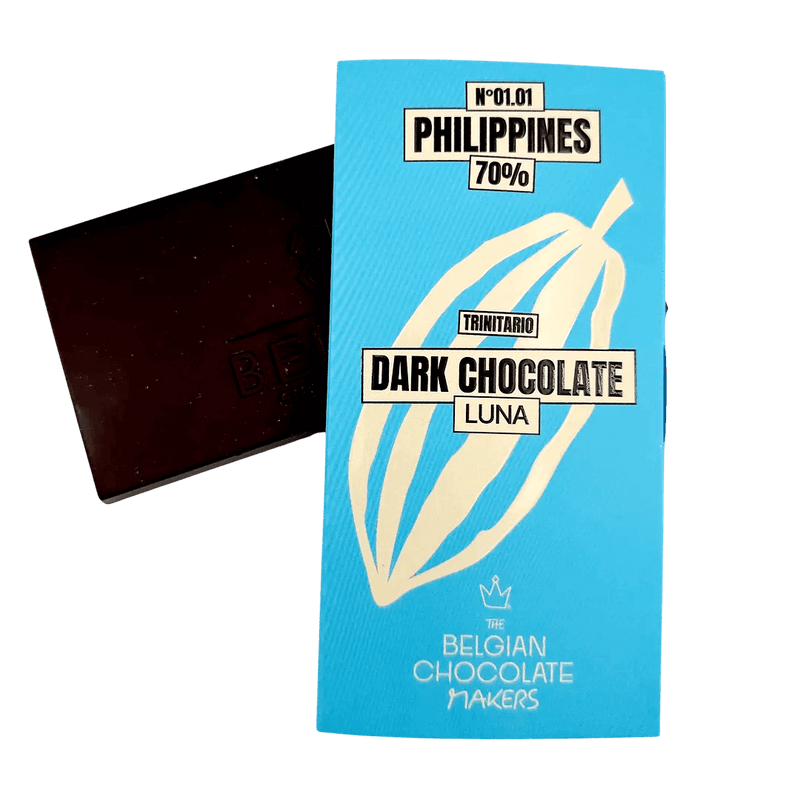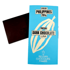Philippines Luna 70% dark chocolate, an exclusive single-origin creation handcrafted in Brussels. Rare cacao with elegant tropical notes and refined depth.