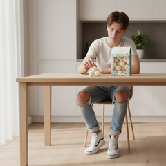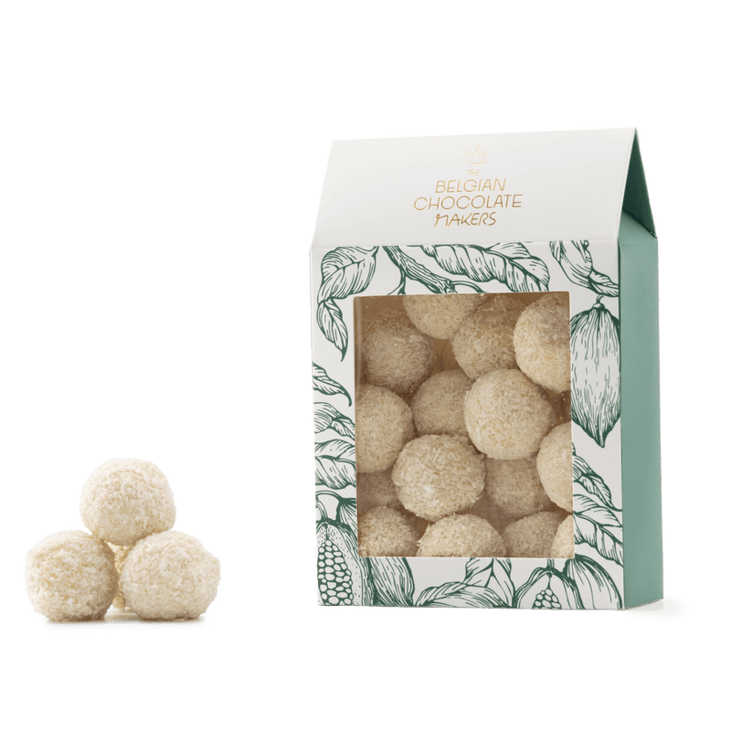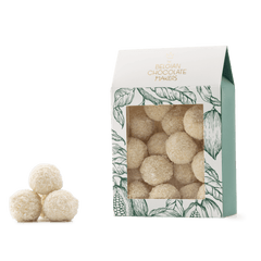 Enjoy our 160g pouch of Belgian chocolate truffles with coconut. Handcrafted in Brussels, marrying rich cacao with exotic coconut flakes for a refined gourmet treat.