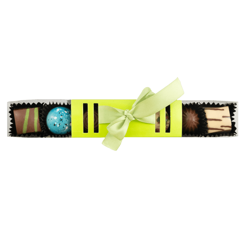 Discover our stick of 7 mixed pralines (105g), a delicious assortment of handcrafted Belgian chocolates featuring our signature bean-to-bar flavours. A perfect small gift or indulgent treat to enjoy anytime.