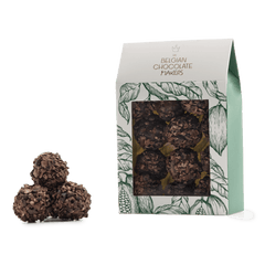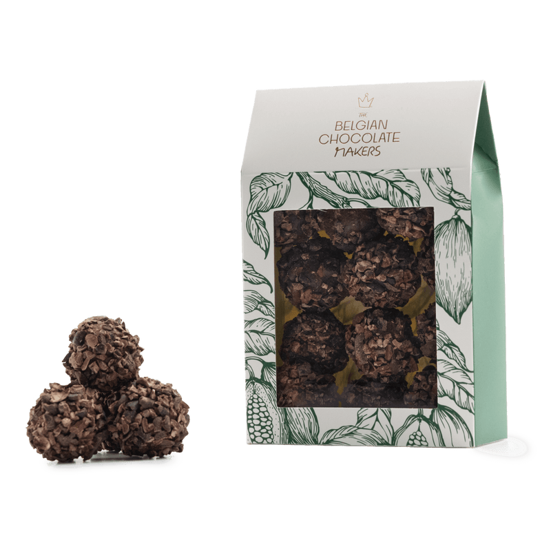 Discover our 160g pouch of Belgian chocolate truffles with cacao nibs. Handcrafted in Brussels, combining smooth cacao with crunchy nibs for an intense gourmet experience.