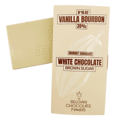 Handmade white chocolate bar with Bourbon vanilla 35%, crafted in Brussels. A 100g creation combining smooth sweetness and refined gourmet elegance.