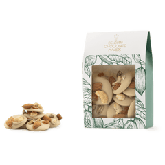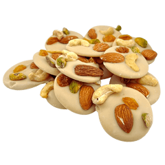 Delicious 150g white chocolate mendiants topped with pistachio, almond, raisin and cashew chunks, a perfect blend of rich cocoa and crunchy goodness.