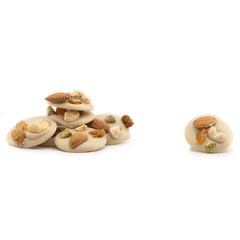 White chocolate mendiants with pistachio, almond, raisin and cashew chunks