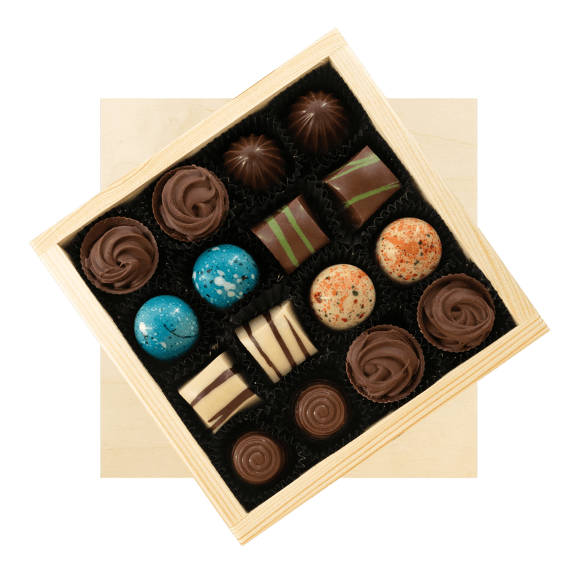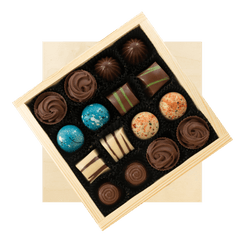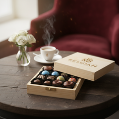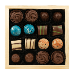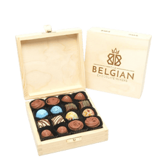 Buy our wooden gift box with 16 Belgian pralines (240g). Handcrafted chocolates made in Brussels, the perfect gourmet gift box for chocolate lovers.